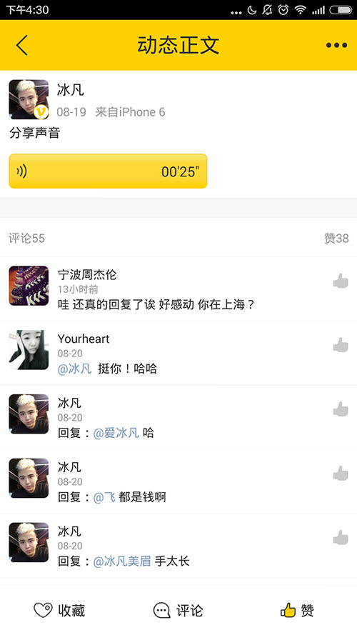 伐木累火速集结电竞、游戏直播圈的红人,布局一个属于红人的社交版图,以冰凡为代表的实力派主播也陆续加入。目前发布的版本置入动态、贴吧、标签等功能,最大的亮点是语音动态和“正在”,语音功能可以让粉丝随时随地听到偶像声音,演唱会、晚安故事,正是冰凡等电竞好歌手的最佳选择;“正在”可以直接通往明星店铺,远离鱼龙混杂的网购市场,保证买到的产品就是主播本人经营。