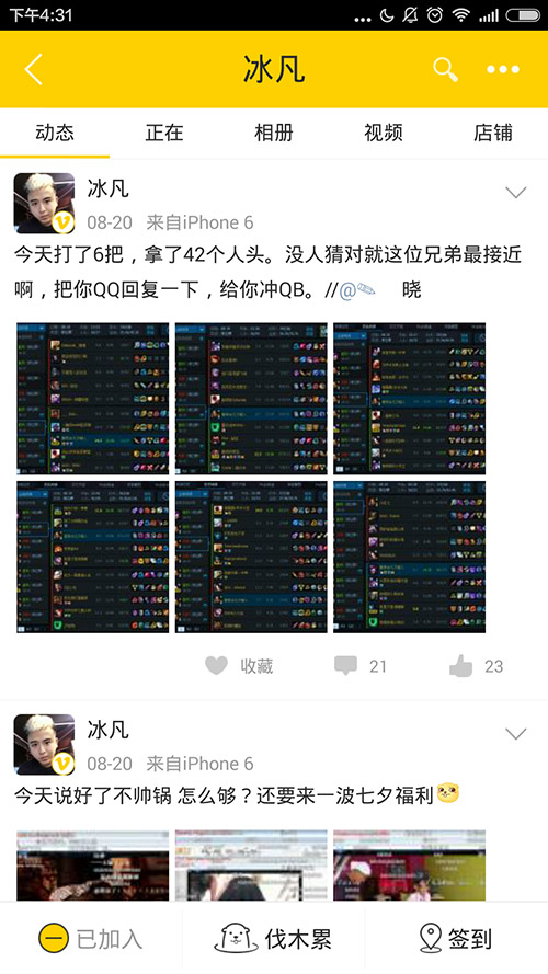 冰凡是早期在斗鱼直播游戏的主播之一,以“一万把豹女”成名,获得大量豹女爱好者的喜爱,他不但爱秀豹女,更爱秀歌艺,所以来到伐木累也向粉丝保证要开满32场演唱会。此番进驻伐木累,一是为粉丝提供一个经过过滤的讨论环境,二是便于集中发布直播、生活动态、奖品福利。