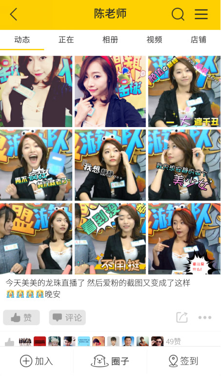 她承诺今后会在伐木累与粉丝零距离交流,各位观众,有想了解的女神另一面,就赶快快加入陈老师的伐木累吧~