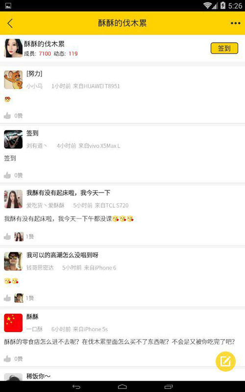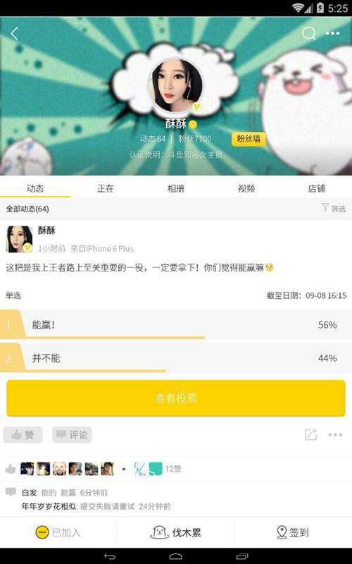 伐木累目前已经拥有草莓、微笑、大奶强、卡卡等超人气明星,逐渐会发展成为主播全覆盖的粉丝交流社区。伐木累目前版本中的的语音、投票等功能都让粉丝大饱眼福,各位已经入住的当红主播每天都会发送个人私照和话题与粉丝互动。平时玩游戏非常认真几乎不看手机的酥酥,线下也非常热爱与粉丝交流。